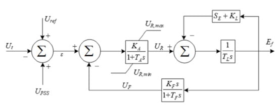 The excitation system provides the excitation power to regulate the generator voltage and control the reactive power distribution of the generator in parallel operation states. It has a great influence on the dynamic behaviors of the generator and has the ability to improve the stability of the power system. The model of the excitation system is shown in Equation (13). The block diagram of the excitation system is presented in Figure 5.