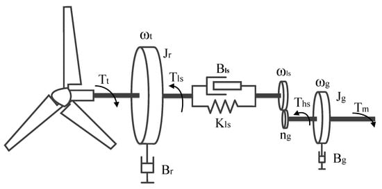 The mechanical drive shaft is an important component of the wind farm (WF), which coupled the wind turbine with the DFIGURE. In this work, a two-mass drive shaft model, as presented in Figure 8, is used, as it describes the energy transfer between medium/high and low speed shafts while comparing with the one-mass model. The dynamic characteristics of a two-mass mechanical drive shaft model can be expressed in terms of the following equations [37]:
