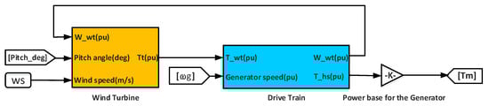 The combined block diagram representation of the wind turbine and mechanical drive shaft model is shown in Figure 9. As shown in Figure 9, the input of the wind turbine are the blade angle and wind speed, and the output is the aerodynamic torque. The input of the drive train are the aerodynamic torque and generator speed, and the output are the wind turbine speed and torque transmitted through the shaft. Then, the torque is transformed to the torque at the input of the generator.