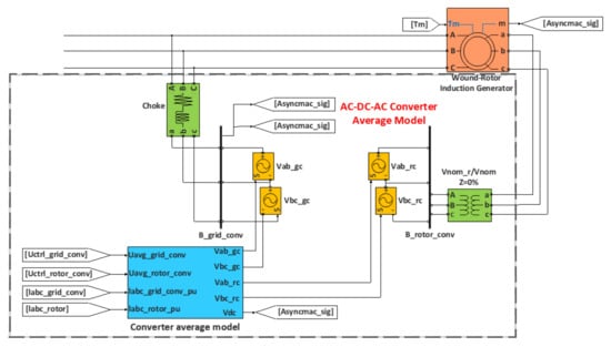 Block diagram of a state-average PWM converter model. In this figure, the parameters Uctrl_grid_conv, Uctrl_rotor_conv, Uavg_grid_conv, Uavg_rotor_conv, Iabc_grid_conv_pu, Iabc_rotor_pu, Vab_gc, Vbc_gc, Vab_rc, Vbc_rc, Vdc, and Asyncmac_sig represent the grid-side converter voltage control signal, rotor-side converter voltage control signal, grid-side average converter voltage signal, rotor-side average converter voltage signal, grid converter current signal, rotor converter current signal, grid-side voltage between phases a and b, grid-side voltage between phases b and c, rotor-side voltage between phases a and b, rotor-side voltage between phases b and c, DC-link voltage, and the asynchronous machine signal, respectively.