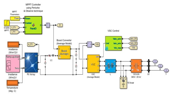 The solar photovoltaic system involves in three components, i.e., the photovoltaic array, photovoltaic inverter and maximum power point tracing (MPPT) controller. Herein, the photovoltaic array contains several parallel modules, and the current-voltage property of each module is expressed by five operating parameters, i.e., current source (IL, which can utilize solar energy to generate current), diode parameters (I0 and NI), series resistance (rs) and shunt resistance (rsh). These parameters are closely to the variation of temperature and irradiation. Besides, the photovoltaic inverter is an important element to ensure system stability during the grid-connected transient process, which can convert the DC to sinusoidal AC in order to successfully link with power grid. Moreover, maximum power point tracing (MPPT) controller is applied in this study to maximize the solar electricity production. The block diagram if the proposed solar photovoltaic system is performed in Figure 11.