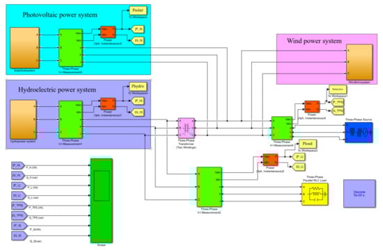 Based on the above proposed wind, solar and hydropower subsystems, a hybrid power system is finally obtained by MATLAB/Simulink [43], as shown in Figure 12.