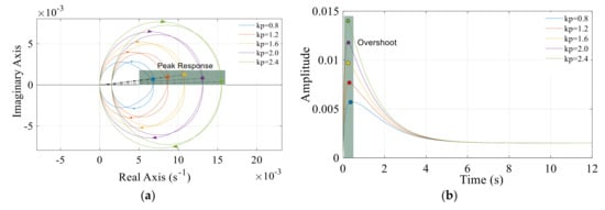 From Figure 13a, there are similar behaviors for Nyquist results as the proportional adjustment coefficient (kp) increases from 0.8 to 2.4. The Nyquist trajectory is a transversely zygomorphic closed curve starting at the origin, and it surrounds twice in the clockwise direction and then returns back to the origin. The curvature of Nyquist trajectory increases after it first go through the real-axis, but the curvature gradually decreases after the second real-axis traverse. All Nyquist trajectories intersect at the origin or at a point near the origin, whereas the peak response is continuously enhanced with the decrease of the proportional adjustment coefficient (kp). Moreover, it is clearly observed in Figure 13b, there are some similarities for the step response of the hydropower system under a different proportional adjustment coefficient (kp). For example, the step response within kp = 2.4 first increases to the maximum overshoot (i.e., 0.014) and then gradually stabilized at the value of 0.002. However, notr that there is the smaller proportional adjustment coefficient, the smaller maximum overshoot. This reveals that the hydropower block has an excellent regulation capacity to the low frequency oscillation of the hybrid system within kp = 0.8 compared with the situation within kp = 2.4