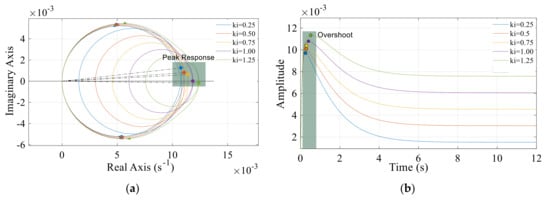 Nyquist and step responses to the variation of the integral adjustment coefficient, ki = [0.25, 1.25]. (a) Nyquist response, and (b) step response.