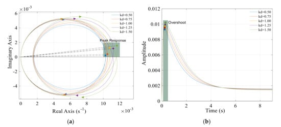 Nyquist and step responses to the variation of the differential adjustment coefficient, kd = [0.5, 1.5]. (a) Nyquist response, and (b) step response.