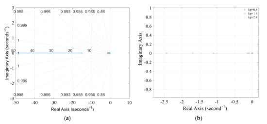 Root-locus response to the variation of the proportional adjustment coefficient, kp = [0.8, 2.4]. (a) Root-locus response at kp = 1.6, ki = 0.75 and kd = 0.5, and (b) root-locus response with the variation of kp = 0.8, 1.6 and 2.4.