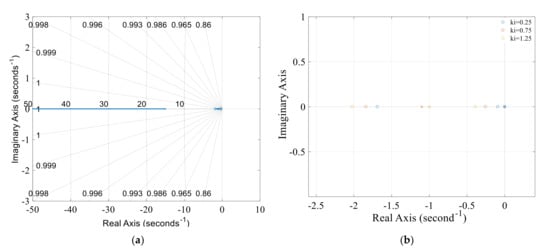 Root-locus response to the variation of the integral adjustment coefficient, ki = [0.25, 1.25]. (a) Root-locus response at kp = 1.6, ki = 0.75 and kd = 1, and (b) root-locus response with the variation of ki = 0.25, 0.75 and 1.25.