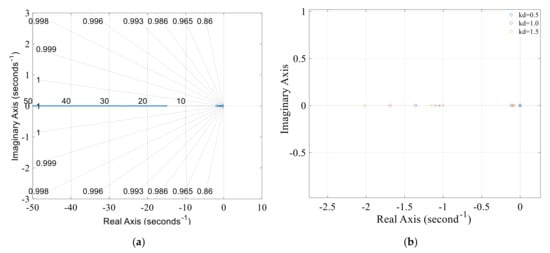 Similarly, the poles and zero points are in the real-axis for kp = 1.6, ki = 0.75 and kd = 1 in Figure 18a. The zero points coordinates are (−0.255, 0) and (−1.84, 0), while the pole coordinates are (−1, 0), (−1.1, 0) and (−15, 0). The first root-locus trajectory is from the pole (−1, 0) to the zero point (−0.255, 0), the second root-locus trajectory is from the pole (−1.1, 0) to the zero point (−1.84, 0), and the last root-locus trajectory experiences from the pole (−15, 0) to negative infinity. All the three trajectories lie in the left half plane, resulting in a steady operational condition of the hydropower system responding to the low frequency oscillations. Moreover, as shown in Figure 18b, the zero point has an opposite trend with the pole with the increase of differential adjustment coefficient (kd), where the zero point moves closely to the imaginary-axis, but the pole is far away from the imaginary-axis. This reveals that there is a rapid response of the hydropower system to the low frequency oscillation within kd = 1 in comparison to the condition of kd = 1.6.