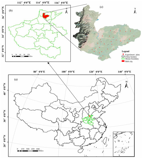 The study area was Hebi (35°26′–36°02′ N, 113°59′–114°45′ E), which is located in northern Henan Province, China (Figure 1). The agricultural fields analyzed in this study area are mainly located on the Huang-Huai-Hai Plain, which has a homogeneous soil texture. Hebi has a sub-humid warm temperate continental monsoon climate. The average rainfall ranges from 349.2 to 970.1 mm, with peaks between May and August. Dry spells occur between November and March, so the seasonal climatic characteristics are favorable for crop farming. The cropping systems in this area usually include wheat, corn, cotton, and canola, and wheat cycles occur between late September (emergence) and the middle of June (harvest) of the following year. A total of 28 samplings in this region were selected on slopes between 0% and 5% (Figure 1c). According to the statistic of Hebi in the 2019 National economic and social development communique, the wheat fields in the study area covered approximately 897.4 km2 in 2019.