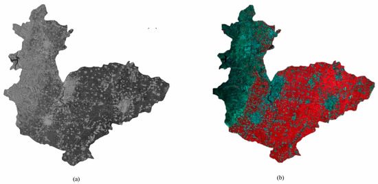 Remote sensing images of the study area. (a) Sentinel-1 SAR image (VV polarization). (b) Sentinel-2 composite false red green blue (RGB) images (Band 8 = red, Band 4 = green, and Band 3 = blue).
