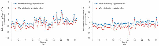 As stated in Section 4.1, the VWC values from the Sentinel-2 vegetation index were used in the formula of the WCM to obtain the soil backscattering coefficient. The corresponding backscatter coefficients for the 84 samples in their image according to the coordinates, their relationships before and after removing the VV vegetation influence, and the VH polarization backscattering coefficient are shown in Figure 5. The backscattering coefficients of VV polarization (Figure 5a) were higher than those of VH polarization (Figure 5b) at the same sampling points. After removing the influence of vegetation, the value of the soil backscatter coefficient was generally lower than that of the total backscatter coefficient. The variation in the VV polarization backscattering coefficient was −2.35 dB, while that of the VH polarization was −2.92 dB. The variation in the VH polarization backscattering before and after the correction was greater than that of the VV polarization. This indicates that VH polarization was more easily affected by the vegetation layer during the transmission process.