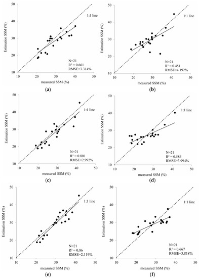 Scatterplot of estimated versus measured SMC (%) values. (a) Radar backscattering coefficient of VV polarization. (b) Radar backscattering coefficient of VH polarization. (c) Soil backscattering coefficient of VV polarization by the original WCM. (d) Soil backscattering coefficient of VH polarization by the original WCM. (e) Soil backscattering coefficient of VV polarization by the modified WCM. (f) Soil backscattering coefficient of VH polarization by the modified WCM.