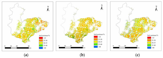 As seen in Figure 7, the retrieved SSM in the study areas were mainly distributed in the range of 25–40%. The result of the SSM retrieval on 3 April was slightly drought, but the SSM in a small part of the central and southern were significantly higher than that in other areas (Figure 7a). There is a possibility of being irrigated of the wheat fields in the dry spring. Due to the fact that there was continuous rainfall in the south of the study area, the results of SSM retrieval were relatively moist in the southern on 3 May (Figure 7b). According to the meteorological data, there was no amount of rainfall in the study area before the satellite’s transit, and this may explain why the SSM was slightly lower on 23 May than that on 3 May (Figure 7c). The SSM retrieval results were basically consistent with the measured SSM. Therefore, the method proposed in this study had strong applicability for the study area.