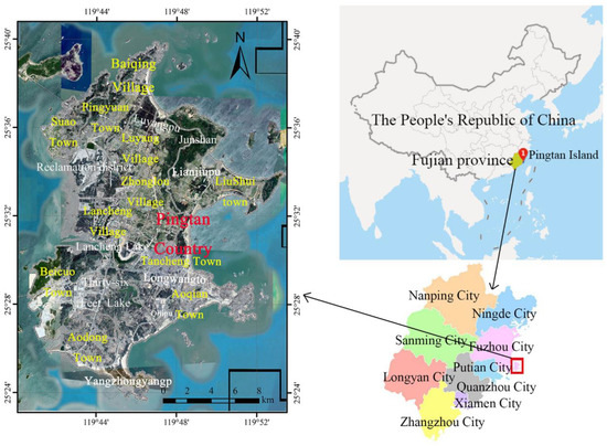 Pingtan Island, located in the east sea of Fuzhou City, Fujian Province, China, extends from 25°15′ to 25°45′ N, 119°32′ to 120°10′ E. The island covers an area of 295 km2 and is the largest island in Fujian Province. The satellite map is shown in Figure 1. The topography of Pingtan Island is mainly a Marine plain with relatively flat terrain. In the north, Pingtan Island is distributed in three NNE-striding hilly areas, among which there are Plains such as Luyangpu, Shangpengyang, Lianjiupu, and Dawopu. In the middle of Pingtan Island, there are Longwangtoupu, Qilipu, and other coastal plains. South has more low hills, hills have the Yangzhongyangpu, Cangxiayang, Dongkunyang, and other small plains. Pingtan Island is characterized by the South Asian tropical maritime monsoon climate and the same season of rain and heat, with an average annual precipitation of 1180.2 mm, water surface evaporation of 1330 mm, and land surface evaporation of 550 mm [17]. Pingtan Island is a region with severe water shortages and drought. Pingtan Island is narrow, and its water system is underdeveloped. It is seasonal rivers with short streams flowing into the sea, and the surface water volume is minimal [18,19].