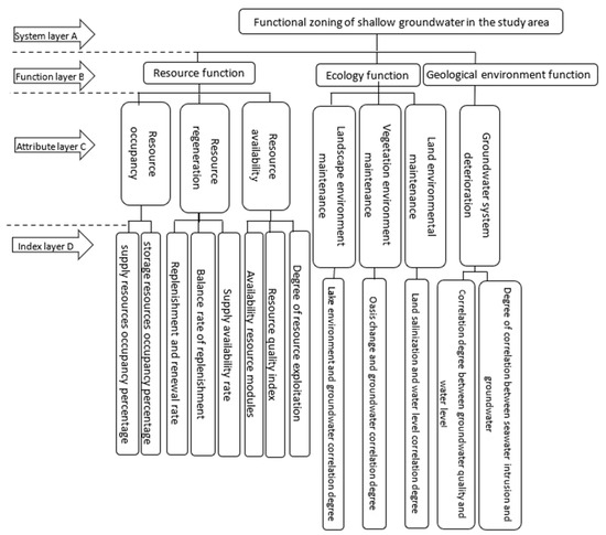 The system layer refers to the target of shallow groundwater function zoning in the study area; the function layer consists of three indexes of resource function, ecology function, and geological environment function.