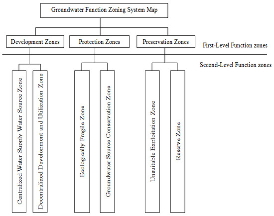 The first-level groundwater function zoning was divided into three types named development zones, protection zones, and preservation zones. Within the framework of the first-level groundwater function zoning, six types of second-level function zones were divided according to the dominant groundwater function groundwater function resource. Among them: