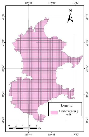 To express the distribution characteristics of each evaluation index more accurately, this paper uses ArcGIS to divide the grid of Pingtan Island. On the grid division method and scale of the study area, through the collection and arrangement of basic data, combining with the area and stratigraphic distribution characteristics of the study area, it is determined to use ArcGIS to divide the grid of Pingtan Island. The grid-scale is 200 × 200 m, and the number of units is 7864. The grid partition of the study area is shown in Figure 4.