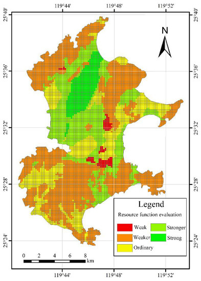 - Resource function evaluation. Resource function includes three attribute indexes: resource occupancy, resource regeneration, and resource availability. According to the unit data and weight of each element index corresponding to the three attribute indexes, the resource function evaluation was completed through the spatial analysis function of ArcGIS. The resource function distribution in the study area is shown in Figure 5.