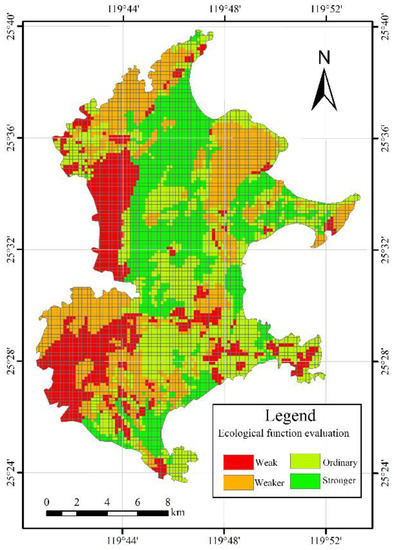 - Ecology function evaluation. Ecology functions including three attribute indexes that landscape maintenance, vegetation environment maintenance, and land environmental relevance, according to the three attributes to the elements of the corresponding element data of indicators and the corresponding weights, through spatial overlay analysis function of ArcGIS, complete ecology function evaluation, the function of resource distribution in the study area is shown in Figure 6.