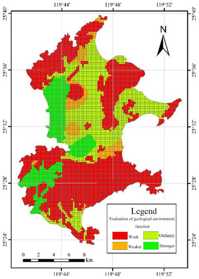 Figure 7. Assessment results of groundwater geology environment function in the study area. - (4)