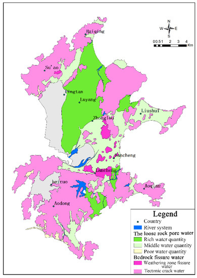 It can be seen from Figure 9 that in the pore water of loose rocks, the water-rich regions are mainly divided into Luyangpu, Qilipu, Lianjiupu, and Longwangtoupu. The water-rich grade is the area with medium water volume, mainly distributed in the plain (Guanjing), Dawopu, Zhifengyang, Yanxiapu, Cangxiayang, Dongkunyang, and Yangzhongyangpu. The water-rich regions were mainly distributed in hilly valleys in Aodong, Suao, Baiqing, and Tandong.The water-rich grade of bedrock fissure is all water-poor area, mainly distributed in Suao, Baiqing, Junshan, Beicuo, Aodong, Aoqian, and other places.
