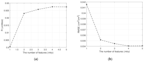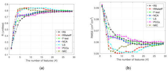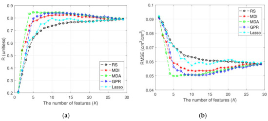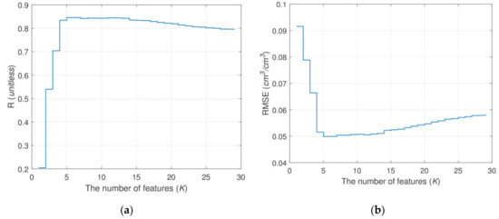 - RReliefF: RReliefF is inspired from Relief [66], which is very powerful in estimating the quality of features [67,68]. RReliefF penalizes the input features that give different values to neighbors with the same response values, and rewards the input features that give different values to neighbors with different response values. We used the 29 features as the input data and the in-situ measurements as the response values. The algorithm selects a random observation and finds the k-nearest observations to it. Then, the weight of SM features can be calculated as follows:where is the weight of having different values for the response y, is the weight of having different values for the feature r, is the weight of having different response values and different values for the feature r, m is the number of iterations. The importance ranking of each feature can be obtained according to this weight.