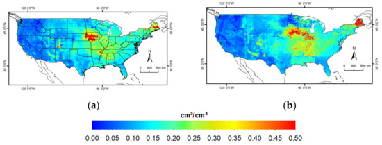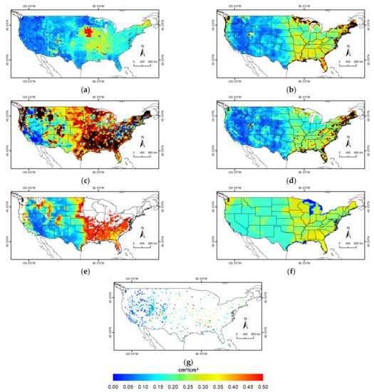 | Yuan et al. [44] | GRNN | 7 (SMAP_TBH, SMAP_TBV, SMAP_Ts, SMAP_VWC, Month, Latitude, Longitude) | No | 1 April 2015–31 March 2018 | 97,843 | 36 km | R = 0.88 RMSE = 0.050 cm3/cm3 bias = 0.000cm3/cm3 ubRMSE = 0.050 cm3/cm3 |