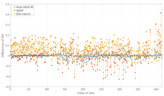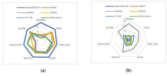 | Ours | RF | 29 (SMAP_TBH, SMAP_TBV, SMAP_TB4, SMAP_Ts, SMAP_VWC, SMAP_albedo, SMAP_landcover, Latitude, Longitude, AMSR2_TBH, AMSR2_TBV, AMSR2_Ts, AMSR2_optc, AMSR2_optx, FY-3B_TBH, FY-3B_TBV, SMOS_TBH, SMOS_TBV, SMOS_opt, ERA_SR, ERA_Ts, ERA_albedo, GLC30_landcover, MODIS_NDVI, MODIS_Ts, MODIS_landcover, DEM, Soil texture, DOY) | Yes | 1 August 2015–31 August 2015 | 5225 | 36 km | R = 0.93 RMSE = 0.033 cm3/cm3 bias = 0.000 cm3/cm3 ubRMSE = 0.032 cm3/cm3 |