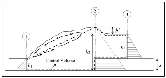 The small jump profile rise at section (2), h′, is justified by the stagnation effect at the end of the hydraulic jump roller, where the whole kinetic energy transforms into the potential energy.