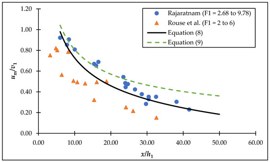where um is the maximum velocity of the jet at any section (x) and Lj is the jump length. The first term on the right-hand-side of Equation (8) indicates the pressure gradient effect. Figure 2 compares Equation (8) with previous classical hydraulic jump experiments for different initial Froude numbers. The curve has a sharp fall followed by a milder fall; the closer to the jump’s beginning, the faster the velocity decay. Equation (8)’s prediction does not differ for various initial Froude numbers, nor the data.