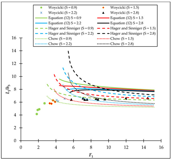 A comparison of Equation (12)’s predictions with the experimental results from Woycicki [14], Einwachter [3], Hager and Sinniger [5], and Chow [15] is shown in Figure 3. Compared to the curves of Hager and Sinniger [5], and Chow [15], Equation (12) indicates a more rational trend, in which the jump length estimation is closer to the data at lower initial Froude numbers. In fact, Equation (12) shows a similar trend to the experimental data, which is more discernable for higher steps. However, for low Froude numbers (F1 < 5), Equation (12) was unable to estimate the jump length, as were the previous estimations. Moreover, larger step heights resulted in more data convergence, whereas little deviation was seen for different step heights at large Froude numbers. The small overestimation of Equation (12) could be justified as the consequence of the wall jet’s velocity distribution assumption. The step’s presence stagnates the approaching velocity, and thus changes the velocity distribution. Furthermore, since few experimental studies have been conducted on jump length at a positive step, more research is necessary to more accurately examine the subject.