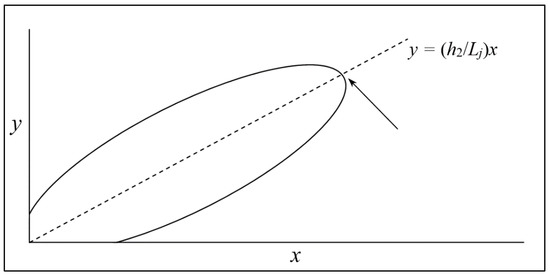 Now, we present an appropriate expression for R, whose determination depends on the streamline profile. Figure 4 shows the jump surface (convex curve) profile. The jump starts at the origin and ends at the point (Lj, h2). The concave curve indicates the closest streamline to the surface, and backward flow exists between the two curves. It seems rational to consider the curves as symmetrical, and that y = (h2/Lj)x is the line of symmetry. From the geometric point of view, the corresponding points in a symmetrical curve have the same curvature radius. The curvature radius of the point (Lj, h2), as the streamline’s endpoint, equals the surface profile endpoint’s curvature radius.