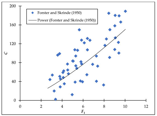 Extracting C from Equation (22), and using the experimental data of Forster and Skrinde [4], as shown in Figure 5, we could extract a power curve (R2 = 0.36) as: