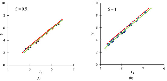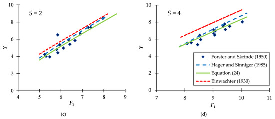 Equation (24) constitutes the critical relationship between relative step height S, initial Froude number F1, and conjugate flow depth Y. Figure 6 shows the variation of Y with F1 for different step heights. It should be noted that each curve’s starting point is the least computable value of Y. In other words, Y is not defined for lower initial Froude numbers. Additionally, Equation (24) indicates an approximate linear trend that rises with the slope of almost unity. Figure 6 also compares Equation (24)’s predictions with experiments of Forster and Skrinde [4] as well as the theoretical models of Hager and Sinniger [5], and Einwachter [3]. Equation (24) presents the most accurate curve with the closest consistency with experiments for different step heights as well as a fair range of initial Froude numbers. Even though previous theoretical models given by Hager and Sinniger [5] and Einwachter [3] diverge from experiments in large Froude numbers, Equation (24) fits the data well, even for high steps and large initial Froude numbers.