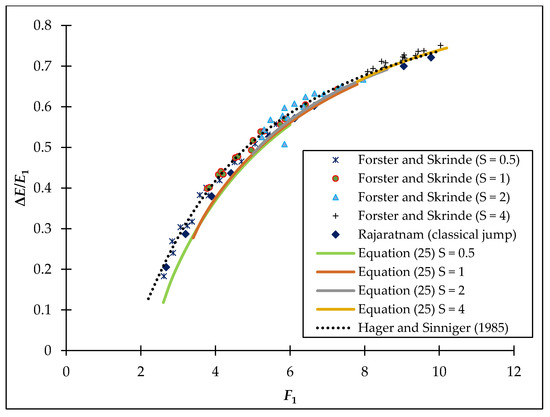 where Y is replaced by Equation (24) to consider the small rise and the flow curvature effect. Figure 7 shows the relative energy dissipation variation with the initial Froude number. In Figure 7, we compare the experimental data from Forster and Skrinde [4] for different step heights, along with the data from Rajaratnam [10] for the jump without a step, and the theoretical estimation from Hager and Sinniger [5] with Equation (25).