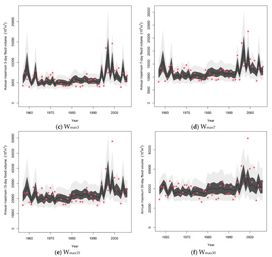 | Annual maximum 3-day flood volume (105 m3) | maximum | 1996 | 26,029 | 22,623 | 19,998 | 15,920 | 12,090 | 9425 |