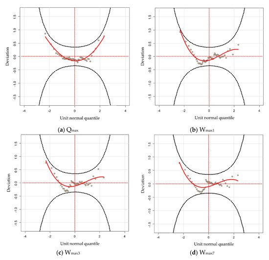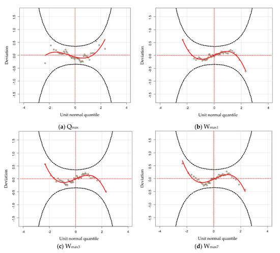 where is the overall degree of freedom of the model, # is the penalty factor. If the penalty factor , it is called the AIC; if (n is the sample size of the explanatory variable), it is called the SBC. The AIC and the SBC are two special cases of the GAIC. The model with the smallest GAIC value is taken as the optimal model. Because the value of the maximum likelihood does not provide information about the quality of the fitting [34]. Therefore, we examine the first four statistical moments of the residuals and the Filliben correlation coefficients [35] ensure that the selected models can adequately describe the systematic part. For the remaining independent and identically distributed random noise, we use the residual diagnostic plot (residuals vs. response, qq-plots and worm plots) for visual inspection [36,37].