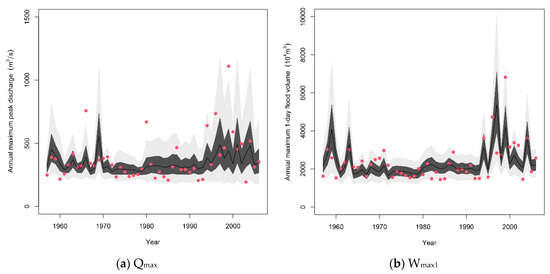 The series of snowmelt flood is modeled using the optimal distribution, with parameters depending on climate factor (Model 2).The red points indicate the actual measured points of the snowmelt flood feature series; the light gray region represents the area between 5th and 25th quantile percentile; the dark gray region in the middle represents the area between 25th and 75th percentile; the upper light gray region represents the area between the 75th and 95th percentile; the middle black curve represents the median (50th percentile).