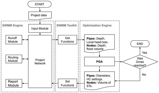 The PGA connects to the SWMM model [37] using a toolkit [38] to carry out a series of simulations in order to find an optimal solution to the problem. To achieve this, the PGA evaluates an objective function composed of four cost functions [18] that are determined based on the results provided by the storm water management model (SWMM) in the simulations carried out. This process is carried out iteratively until a defined stop criterion is reached. Figure 1 summarizes the operation of the optimization model.