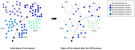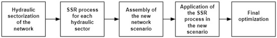 Equations (6)–(9) show the importance of the problem size to define the genetic operators. This is one of the main reasons why the SSR is a useful tool when facing problems from a heuristic approach. In the case of large drainage networks, the large number of DVs becomes an important problem. This high number of DVs demands significant computational effort. The drainage networks consist of branches that serve different sub-catchments, and their runoff flows are added to the network, discharging their waters to a bigger pipe. In other words, the network can be seen as a set of hydraulic sectors (HSs). If these sectors can be identified, a particular analysis of them can be carried out to reduce the number of DVs within the sector and consequently reduce the SS. The optimization process begins by identifying the HSs that composed the network. The optimization model is configured to include the DVs that composed the HS to be optimized. The SSR method is applied to each HS, thereby defining a smaller search region in each HS. Once the SSR process has been carried out for every HS, a new scenario of the network is assembled, where the least prominent regions containing the best solutions have been eliminated. The SSR method is applied to this new scenario to eliminate the least interesting sectors of the new network scenario. Figure 2 illustrates how the application of the sectorized SSR method would work.