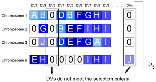 The process of SSR has as a first step a mapping with the optimization model of the entire SS and the decision variables of STs, and pipes are analyzed by the algorithm using a list of options with coarse discretization. The use of a coarse options list allows the identification of the DVs that may be included in the most promising region of the algorithm’s exploration space. For this, a certain number of evaluations Nit is established, and from the results obtained the fifth percentile (P5) of the solutions is selected. In the selected P5, each chromosome is analyzed, quantifying how many genes different from 0, called valid genes, have been obtained for each DV. If a DV does not have at least 20% valid genes, it is assumed that this DV is not part of the promising region of the SS, and it is eliminated from the new SS. If, on the contrary, a DV presents a high repeatability of valid genes, it is considered a candidate to be contained in the most promising search region. The percentage of 20% is then established as the criterion for the selection of variables to be considered in the SS. Figure 6 shows an example of how the selection criteria work in the SSR.