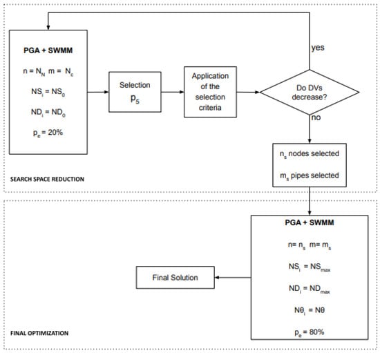 One of the first works was carried out by Schraudolph and Belew [33]. These authors presented an approach based on dynamic parameter coding to adaptively control the mapping of fixed-length chromosomes to real values, so that, at each iteration, the algorithm searches a smaller SS. Ndiritu and T.M. Daniell [34] presented a modified GA combining a fine-tuning strategy to reduce the SS with a hill climbing strategy to move to more promising regions. In recent research, Sophocleous, Savić, and Kapelan [35] presented a model to detect and locate leaks in water distribution networks. The model employs two stages: search space reduction, and leak detection and location. In the first stage, they reduce the number of DVs and the range of values that they can take through an analysis of the characteristics of the network. For the second stage, they used a GA to find the solution to the problem. Simultaneously, Ngamalieu-Nengoue, Iglesias-Rey, and Martínez-Solano presented a methodology to search space reduction (SSR) applied to a drainage network rehabilitation model. The reduction of the SS is based on locating the possible nodes in which storm tanks (STs) will be installed and subsequently identifying the possible pipes that should be renewed. The process is carried out by reducing the number of DVs and the range of values that they can adopt. In a later work Bayas-Jiménez et al. [18], they used the same methodology to optimize drainage networks. The authors included in the optimization process the use of hydraulic controls that certainly improved the results obtained, but that considerably increased the SS. The proposed methodology continues and complements these works with the aim of improving the efficiency of the optimization process. Specifically, the method reduces the SS using the sectorization criteria to improve calculation times and reduce the computational effort required. To achieve this, an SSR method is applied in each hydraulic sector, decreasing the DVs and defining a final search region. Once the region that is presumed to have the best solutions is delimited, a final optimization is carried out to find the best possible solution. The method is applied to different drainage networks to prove its benefits.