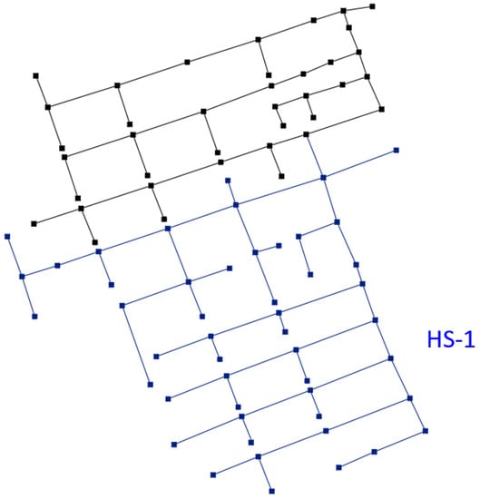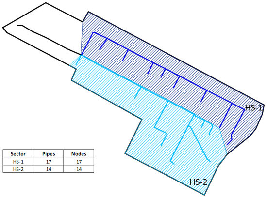 According to its configuration, two hydraulic sectors, HS-1 and HS-2, could be identified in the network (Figure 8). HS-1 composed the upper part of the network with 17 pipes and 17 nodes, while HS-2 composed the lower part of the network with 14 pipes and 14 nodes. Although smaller sectors might be identified, the number of DVs of these branches was too small to be interesting enough to analyze them separately. Therefore, separating the network into two sectors was considered a more advantageous option. The nodes and pipes excluded from both sectors were added to the optimization process in the assembly of the new scenario that was generated after reducing the SSR process of the SHs.