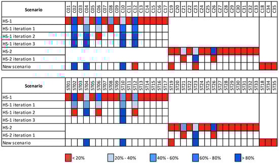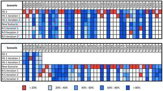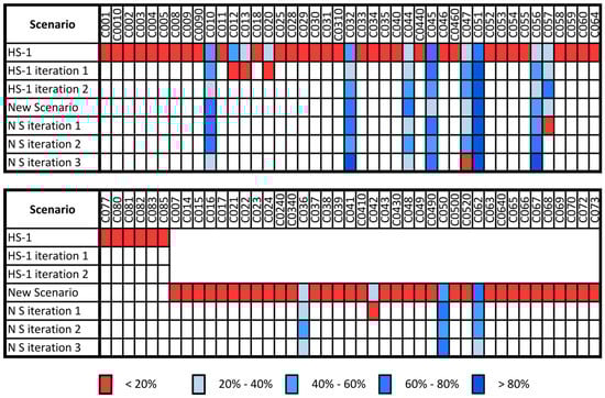 Figure 10 summarizes the SSR process in the E-Chicó network. In the first step, HS-1 and HS-2 were processed separately. Once the number of variables was reduced, a new scenario was set up with the remaining DV from HS-1, HS-2, and the elements not included in any HS (conduits C18, C34, and C35, and the corresponding tanks ST18, ST34, and ST35). The results showed that certain DVs had a higher repeatability. By applying the selection criteria, the areas of the SS that were less interesting to explore were eliminated, thus defining a new SS. While the SS was reduced, the repeatability increased in the most promising DVs to be considered in the final analysis region. With the SS reduced in the HSs, the new search scenario was assembled that included the nodes and pipes obtained in the previous process and elements of the network that had not been analyzed. To perform the final optimization, the DVs of the HCs must be added to this region.