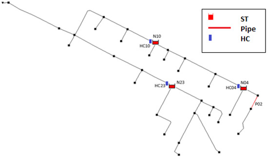 The final solution required the renewal of a pipe (C02) that increased its diameter from 0.4 m to 0.5 m. The installation of STs was in nodes N04, N10, and N23 with volumes of 1462 m3, 2300 m3, and 1958 m3, respectively. The installation of HCs in the pipes C04, C10, and C23 had k values of 72.55, 14.73, and 14.73, respectively. Figure 11 illustrates the elements to be installed in the network. The costs of the final solution found by the optimization model are shown in Table 4. With these actions, we had the necessary infrastructure costs to optimize the network as follows: cost of pipes = 6583.81 €, cost of STs = 179,757.70 €, and cost of HCs = 7671.78 €. The cost of flood damage was 5700.66 €. Thus, the objective function took the value of 199,713.95 €. This value contrasted with the cost obtained when applying a standard GA optimization without SSR. In the latter case, the optimal value found after 250 runs of the algorithm was 251,711.79 € (26% more expensive).
