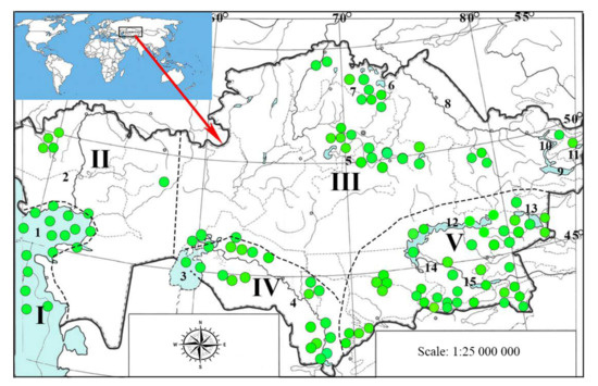 Schematic map of the location of the surveyed water bodies of Kazakhstan and their distribution by zoogeographic provinces and regions: I—Ponto–Caspian region, II-V—European–Siberian subregion of the Palaearctic region, including II—Volga–Ural province, III—Irtysh province, IV—Turkestan–Aral province, V—Balkhash province of the Nagorno–Asian region. Water bodies and systems of water bodies are designated in Arabic numerals: 1. The Caspian Sea, 2. Ural River, 3. The Aral Sea, 4. Syrdarya River, 5. Water bodies of the Nura River Basin, 6. Naurzum Lakes, 7. Shchuchinsko-Borovsk Lakes, 8. River Irtysh, 9. lake Zaysan, 10. Bukhtarma Reservoir, 11. Lake Markakol, 12. Lake Balkhash, 13. Alakol-Sasykol system of lakes, 14. Ili river, 15. Kapshagai reservoir.