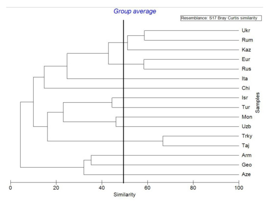 Dendrogram of the similarity of the species composition of Calanoida in countries with different climatic conditions. Abbreviations: Isr—Israel, Tur—Turkmenistan, Mon—Mongolia, Uzb—Uzbekistan, Taj—Tajikistan, Rus—Russia, Kaz—Kazakhstan, Chi—China, Arm—Armenia, Geo—Georgia, Aze—Azerbaijan, Trky—Turkey, Ita—Italia, Eur—Europa (in total), Rum—Romania, Ukr—Ukraine.