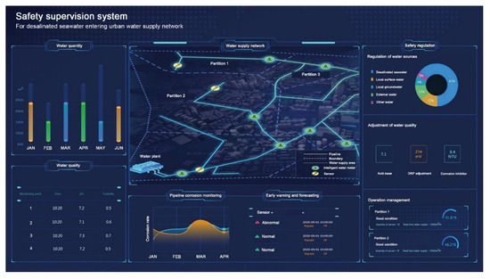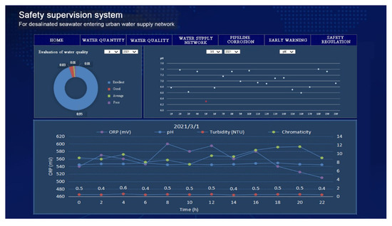 36], which posed a huge challenge to ensuring the stability of desalinated seawater quality and the safety of water supply network. Therefore, in this study, the safety supervision system for desalinated seawater entering urban water supply network was constructed through the development, integration, and application of key technologies. The system does not only monitor the quality, quantity, and pressure of desalinated seawater in the network, but also adds the corrosion monitoring function. Therefore, when the water quality of the pipeline network is abnormal or exceeds the standard, the system will give an alarm and activate the safety regulation system. The construction of the system provides technical support for the safety guarantee of desalinated seawater entering the urban water supply network.