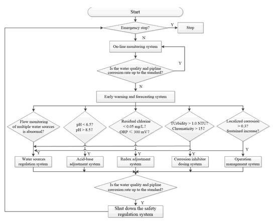 The water quality adjustment system is activated when the water quality exceeds the standard and causes a warning alarm in the desalinated seawater supply network. When the pH value is lower than the limit, the acid-base adjustment system is activated. The supervisory system adjusts the pH value by adding NaOH solution and adjusts the alkalinity by NaHCO3 and CO2 until the water quality reaches the standard. The redox control system is started because of the low ORP value and residual chlorine. After the weak current signal is transmitted to the control electric box, free chlorine (NaClO) or monochloramine (NH2Cl) is injected at a certain flow rate with a syringe pump. When the ORP value reaches the highest limit, the syringe pump is automatically turned off, and the change of residual chlorine is continuously monitored. In the case of excessive turbidity, chromaticity, and corrosion rate in the pipeline network, in addition to the water source regulation system, acid-base adjustment and redox adjustment system, the corrosion inhibitor dosing system can also be activated to dose orthophosphate, polyphosphate or silicate in stages. On the other hand, the operation management system adjusts the water flow rate and residence time of the pipeline network through flow meters and pump. Within a certain range, water quality control does not need to stop the water supply, unless the water quality is seriously bad and affects the health of residents. In this case, the water supply must be stopped, and the water supply can only be restored after the water quality reaches the drinking water standard and the pipe network is flushed. In short, whether the water is cut off during safety control needs to be confirmed by the manager through on-site confirmation and water quality monitoring results.
