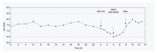 Further, to test the warning and safety regulation functions of the system, a hydrochloric acid (HCl) solution was added to reduce the pH to 6.5. After 4 h, the alarm system was activated. The safety regulation system started after manual confirmation. The acid-base adjustment system added the NaOH solution slowly until the pH returned to the normal range (about pH 7.5). The pH change trend during acid-base adjustment was monitored in real-time (
